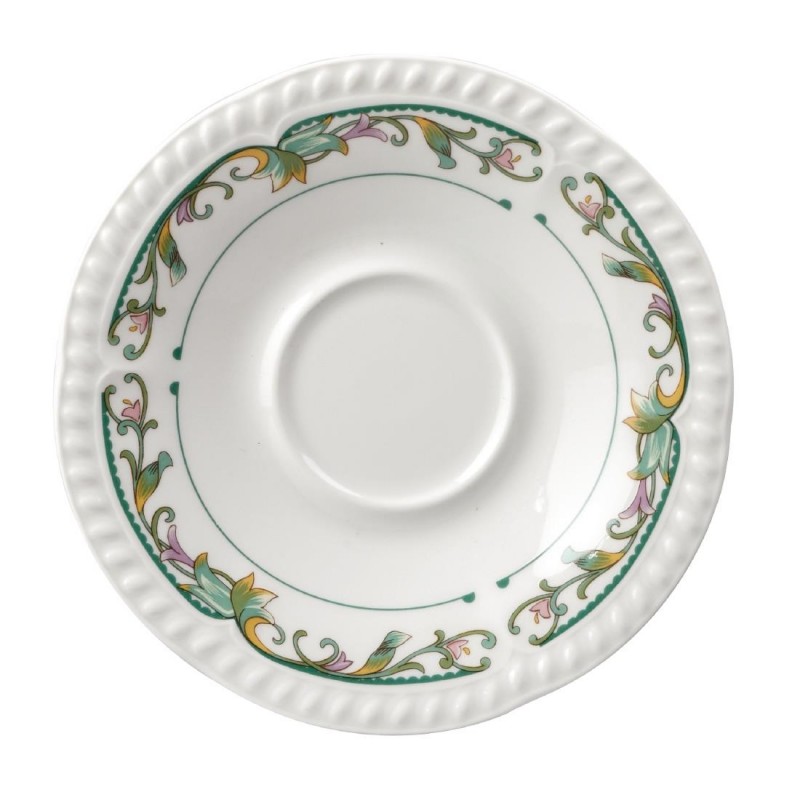 Elegant printed large saucers by Churchill with a tropical floral design featuring the delicate embossment of the Buckingham shape featuring a durable glaze which provides an ultra smooth surface for presentation.