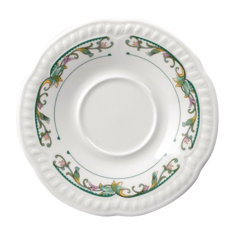 Elegant printed small saucers by Churchill with a tropical floral design featuring the delicate embossment of the Buckingham shape featuring a durable glaze which provides an ultra smooth surface for presentation.