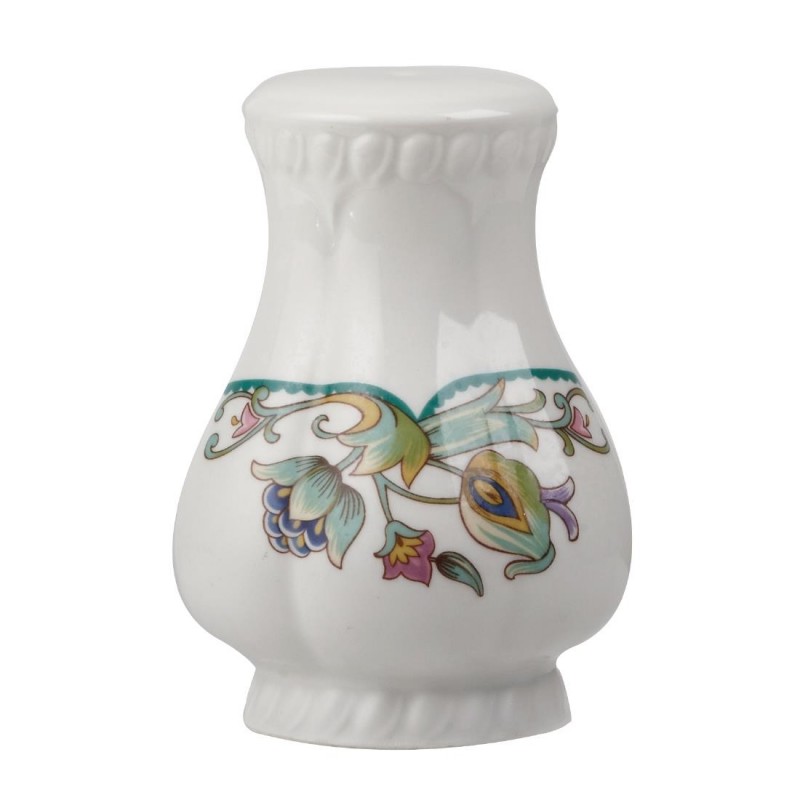 Elegant printed 3 ½" salt shakers by Churchill with a tropical floral design featuring the delicate embossment of the Buckingham shape featuring a durable glaze which provides an ultra smooth surface for presentation.