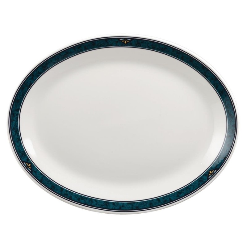 Add an air of opulence to every dining occasion with Churchill's range of Verona crockery available on a number of different whiteware pieces. Finely designed with a deep green marbled border and jewelled motif these classical elegant oval shaped 12" platters are durable with a fully glazed foot and edge.