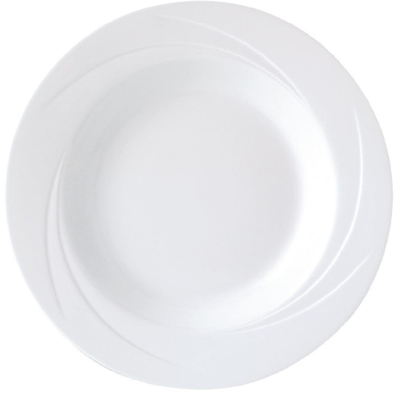 With flowing curves and a subtle embossment the Alvo crockery range assures outstanding food presentation to complement any cuisine.This 9 ½" soup or pasta bowl combines the pure white delicacy and translucence of finest china with exceptional durability with features including thermal shock and stain resistance and a robust glaze.