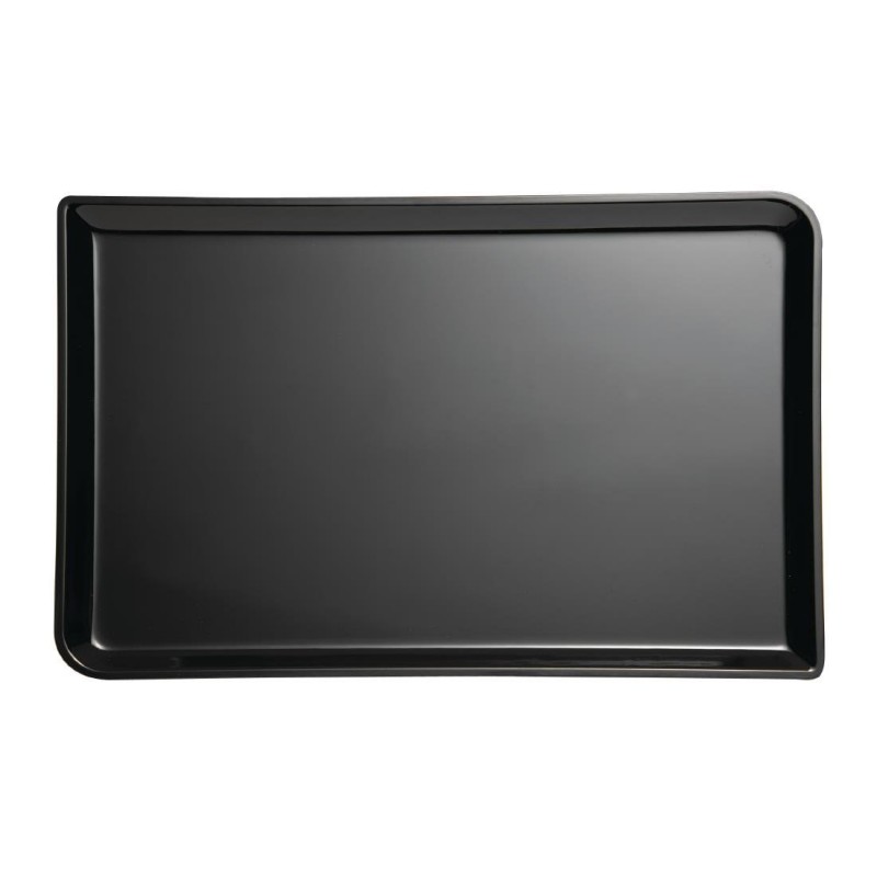 A black flexible and modular countertop buffet display system with two rounded and two square corners allowing pieces to fit closely together yet to be easily removable.