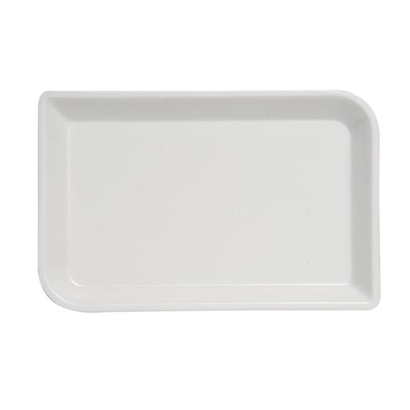 A white flexible and modular countertop buffet display system with two rounded and two square corners allowing pieces to fit closely together yet be easily removable. Transparent lids available.