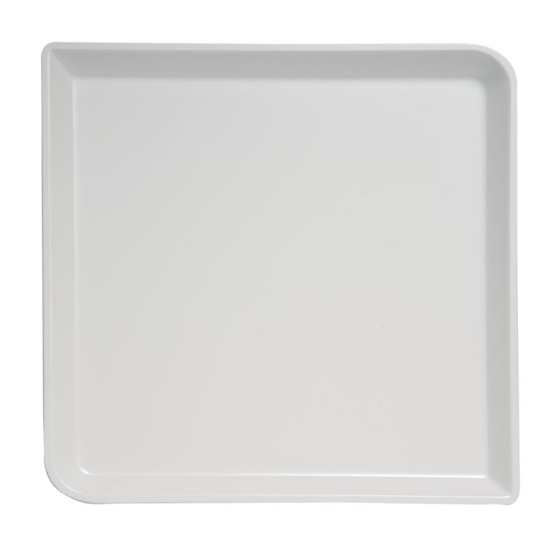 A white flexible and modular countertop buffet display system with two rounded and two square corners allowing pieces to fit closely together yet to be easily removable.