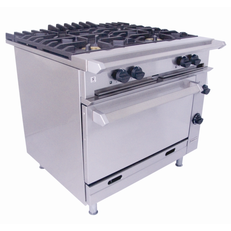 The heavy duty open top Falcon Chieftain 4 Burner Natural Gas Range G1006X-NG from best-selling brand Falcon comes as standard with four burners and a thermostatically-controlled oven. The range is constructed of stainless steel with robust cast iron pan supports and the gas oven has a single reinforced drop-down door. Anti-tilt shelves in the oven help prevent accidents when removing items. The open hob gas taps have fixed high and low settings and are fitted with flame failure devices to shut down the gas supply in the event of a burner being accidentally extinguished making the hob as safe as possible. The oven has five shelf positions and a precision temperature control provided by a direct acting thermostat.