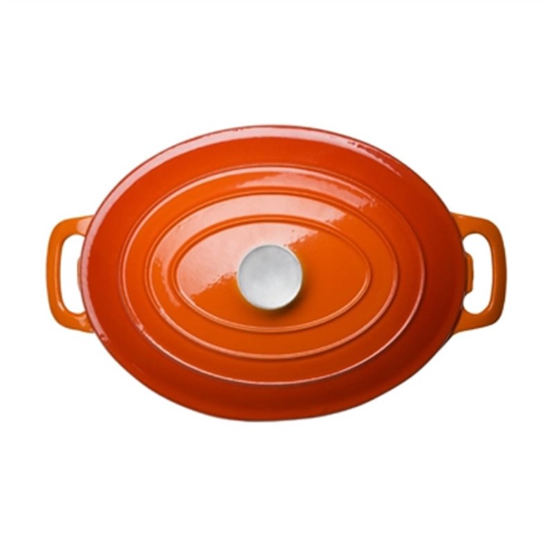 A traditional oval cast iron casserole dish with a handle on each side and a stainless steel knob on the lid. This large dish has excellent heat retaining properties and provides even heat distribution. This attractive orange dish is ideal for oven to table use. The lid of the dish also features an innovative moulding shape which allows your dish to 'self-baste'.