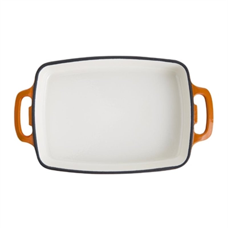 A traditional rectangular cast iron casserole dish with a handle on each side for easy lifting. This dish has excellent heat retaining properties and provides even heat distribution. This attractive orange dish is ideal for oven to table use especially for serving up large casseroles lasagnes and pies.