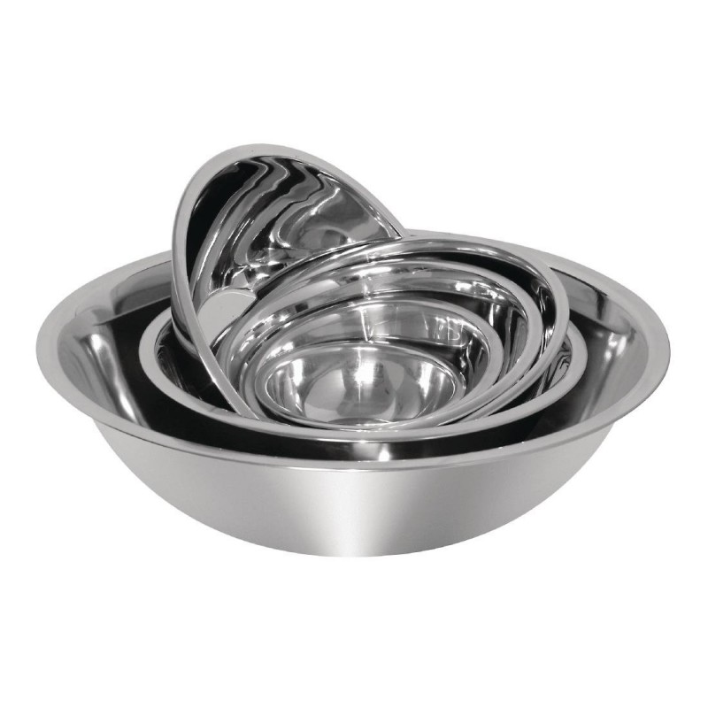 Stainless steel stackable mixing bowl from Vogue. Durable design featuring a flat bottom for stable use.