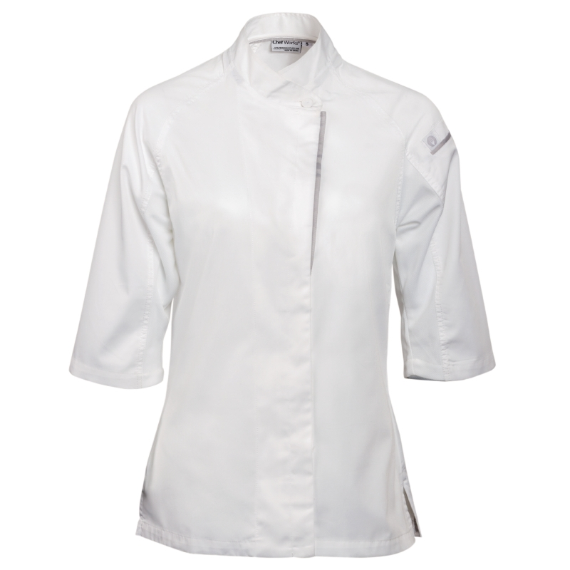 A contemporary and tailored ladies Chef Works coat (XS) in white with grey panels which is stylish and feminine as well as functional with Cool Vent panels under the arms and back sleeves it helps regulate body temperature to keep you cooler in the kitchen.