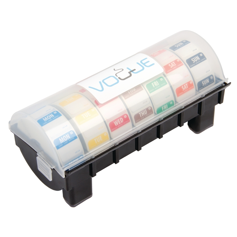 Vogue starter kit featuring 'day of the week' removable labels and a 1" dispenser for the best value as well as convenient dispensing. This kit includes day of the week labels (L930 - L936) and plastic 1" label dispenser.