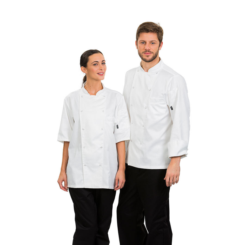 Brigade Chef's Cotton Jacket Short Sleeve. Lightweight 50% cotton for a softer more comfortable jacket. Available as long or short sleeved styles. 50/50 Polycotton strong prym popper fastening breast pocket and pen pocket french cuff design.