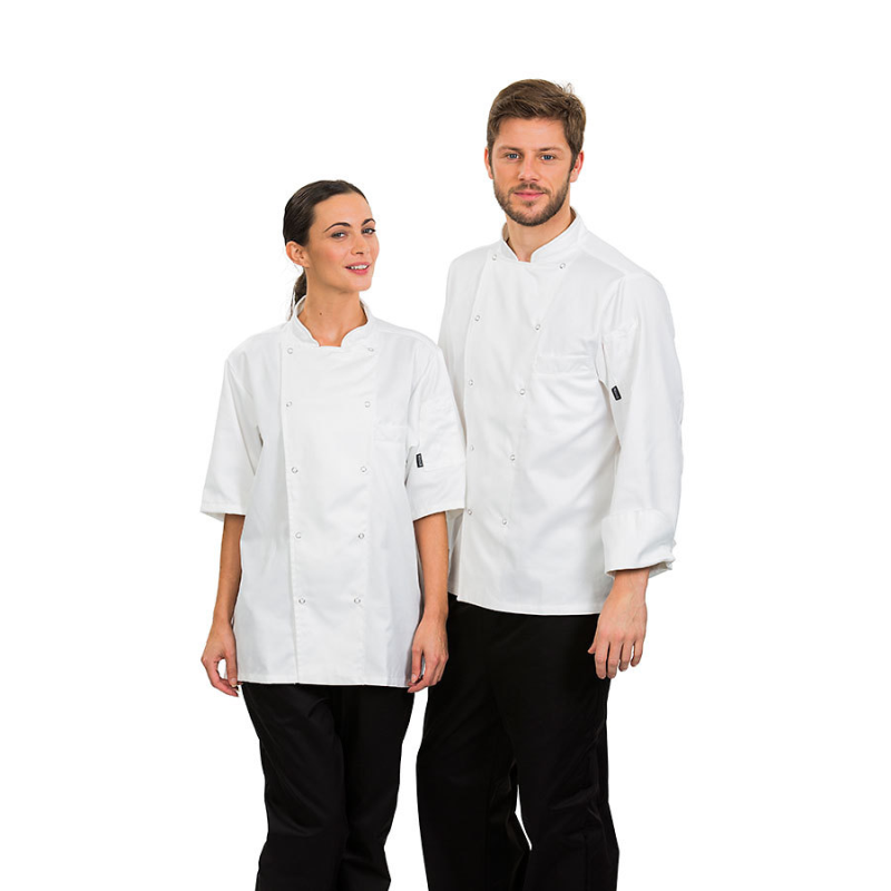 Brigade Chef's Cotton Jacket Long Sleeve. Lightweight 50% cotton for a softer more comfortable jacket. Available as long or short sleeved styles. 50/50 Polycotton strong prym popper fastening breast pocket and pen pocket french cuff design.