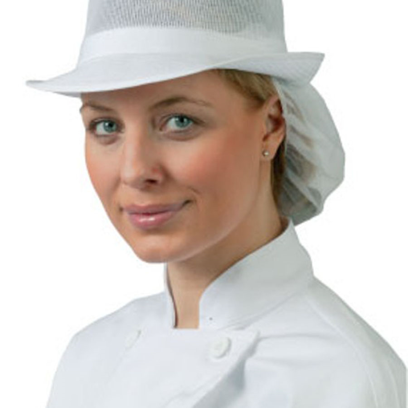 Mesh Hat With Snood Headwear White M. 'All food handlers should wear suitable head covering which completely encloses the hair!' The Institute of Environmental Health Officers. Robust nylon mesh hat with fitted hair snood. Washable treated to repel stains. White.