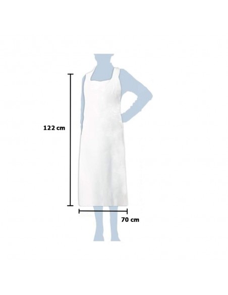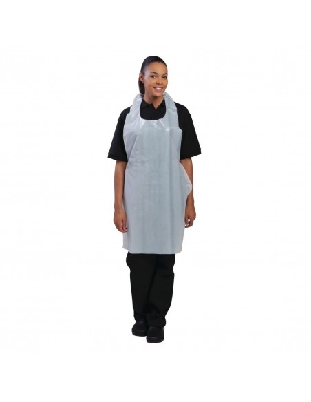 Disposable Apron Standard White. o Strong polythene disposable aprons o Fluid and bacteria resistant o Available in Blue as standard or long length o Sold in packs of 100.