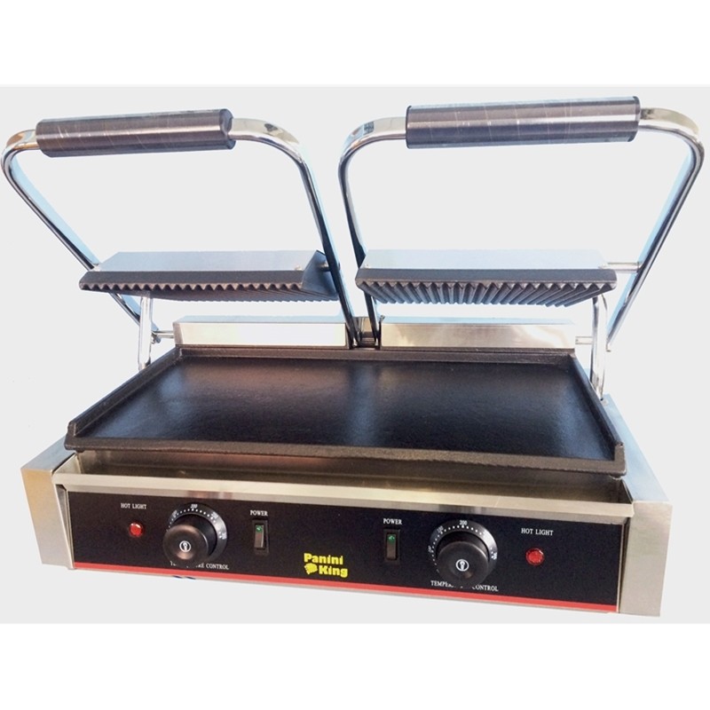 Double Contact Panini Grill with cast iron ribbed plates and smooth bottom. Our contact grills can meet the demands of and busy kitchen. The contact grill achieves its results by cooking food between two heated surfaces. This method has many benefits over the conventional griddle; it cooks much more quickly, seals the food more effectively and locks in more of the juices thus improving the flavour and reducing shrinkage.