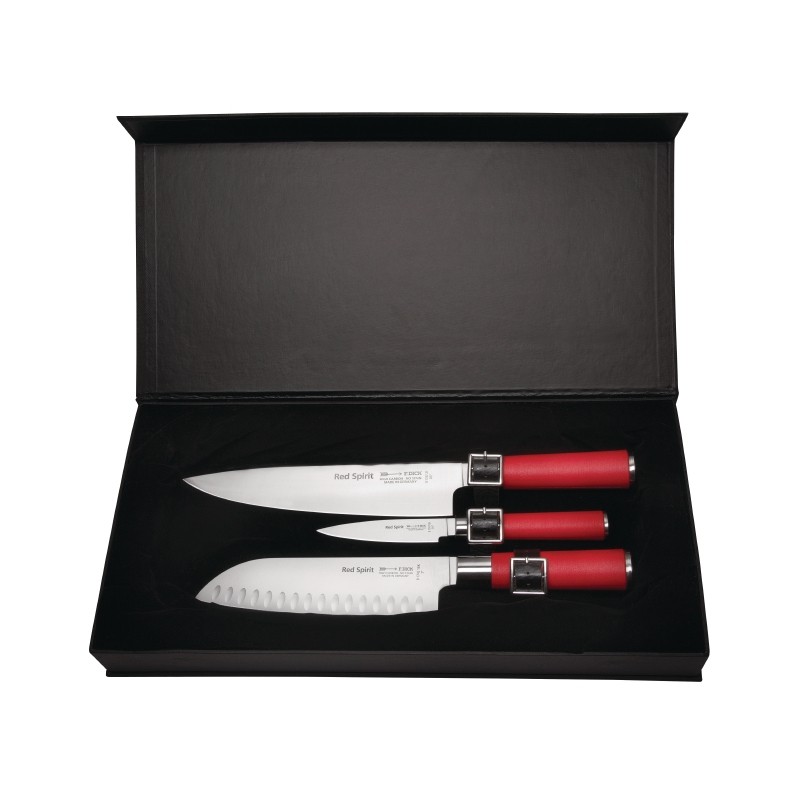 Combining centuries-old Asian craftsmanship with state-of-the-art German technology the Red Spirit range knife from Dick offers the ultimate in precision and reliability. This premium quality knife set includes three knives from the Red Spirit range including a chef Santoku and Paring knife all of which are made from high alloyed stainless steel which has been laser tested to ensure it provides the most precise cut possible. This set will make the perfect gift for any chef and comes presented in a luxurious lined presentation box.