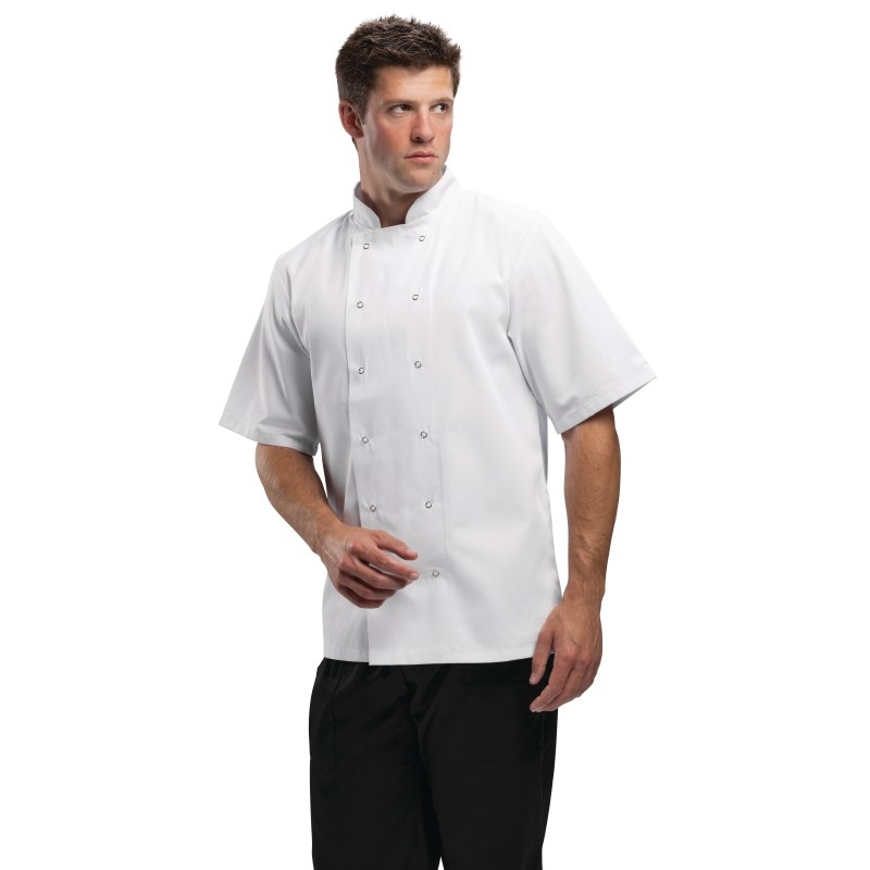 Whites branded this unisex 'Boston' chefs jacket is a lightweight alternative to the traditional chefs jacket. Featuring short sleeves and stainless steel press stud fastenings this item of workwear is both practical and presentable.Need advice on choosing the right size? Click the 'product size guide' tab for more information.