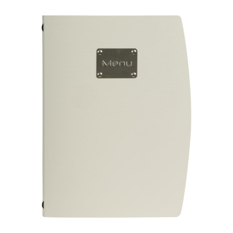 Modern Rio A4 Menu Holder in silver with "menu" engraved stainless steel plate on cover. Made from durable plastic with a textured design the holder is easy to clean. Elasticated inner cord holds inserts securely in place. One double insert included (displays 4 pages).