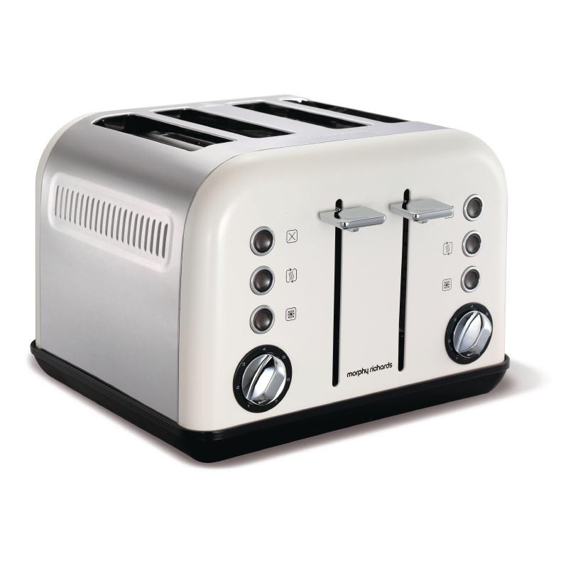 With four large slots and stylish design the Morphy Richards 4 slice Accents Toaster in White is perfect for the busy home kitchen where functionality and style are essential. The toaster naturally includes all the features you would expect in a modern home toaster such as adjustable browning control removable crumb tray and defrost setting. Simply place the slices into the slots to create fantastic quality toast cooked to perfection.