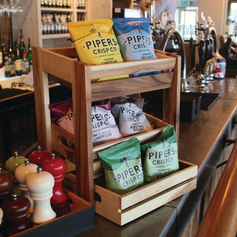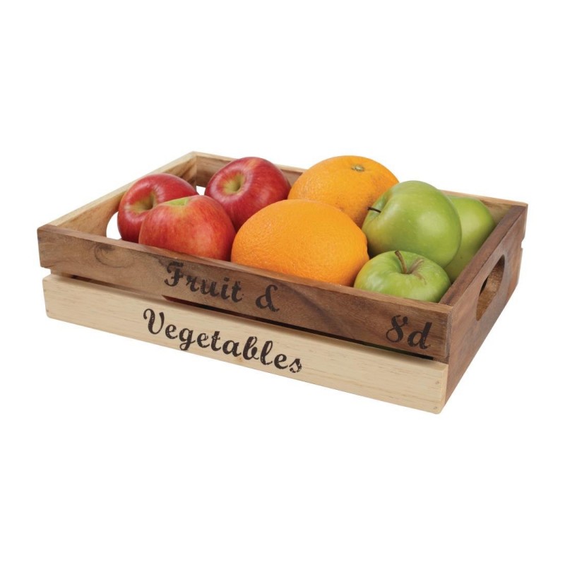 Rustic acacia crate shows the grain of the wood making each crate unique and perfect for attractive food display. "Fruit and Vegetables" printed on one side only so can be turned to show off blank side only if desired.