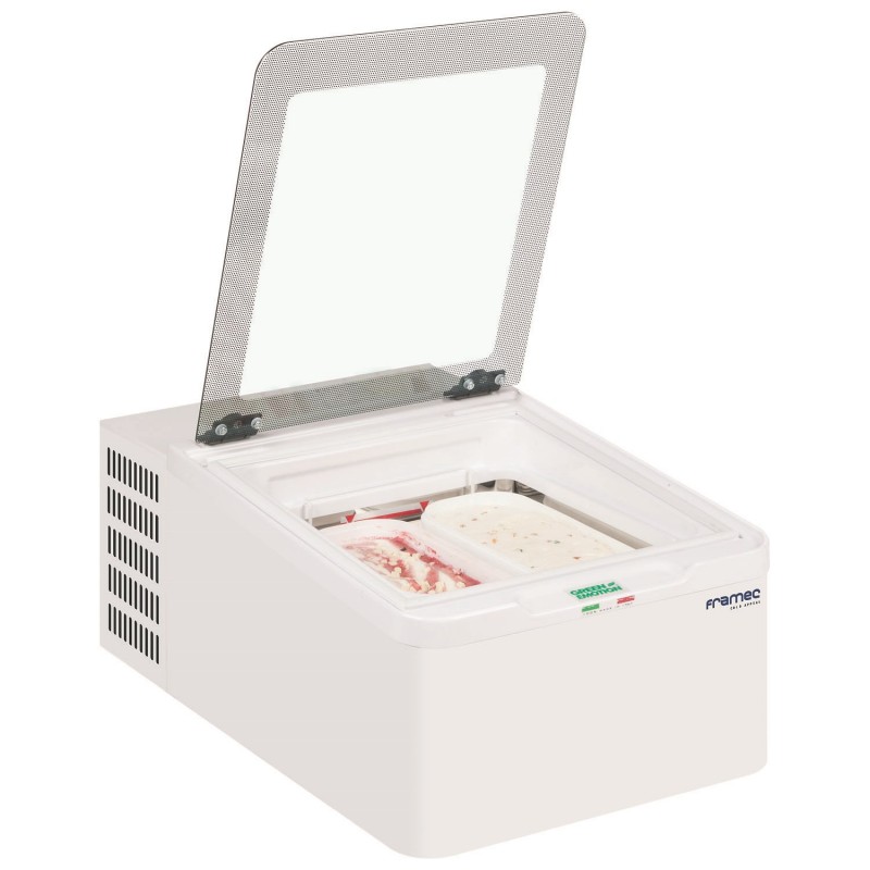 Ideal for where space is tight but you want to maximise sales of scooping ice cream. The ICE2V from Framec is a counter top 2 scoop ice cream freezer. The unit holds 2 5ltr Napoli pans and comes as standard with hinged perspex canopy and temperature display.
