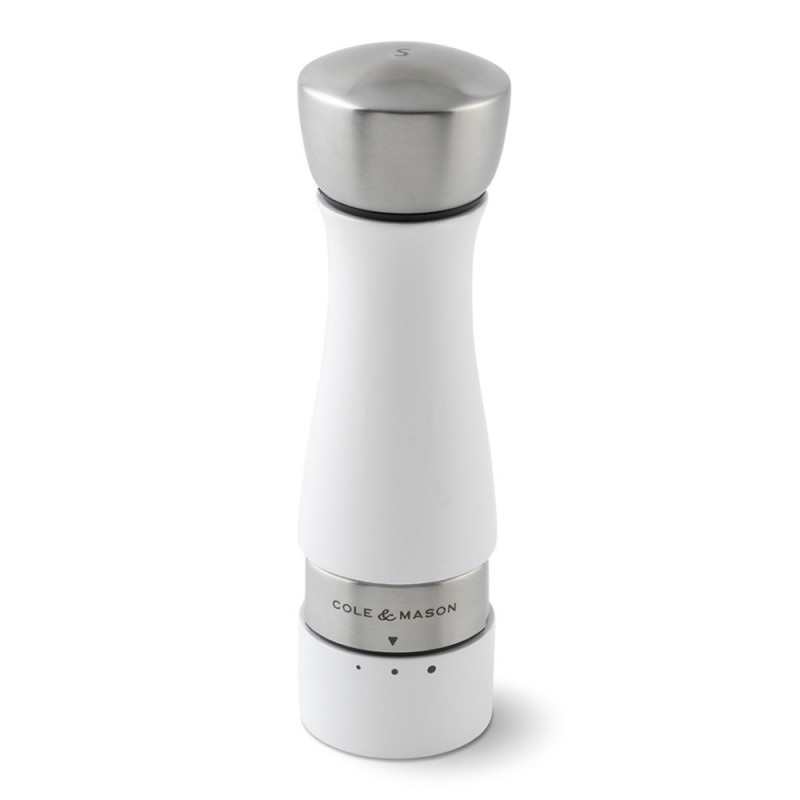 A beautiful and striking contemporary shaped salt mill with a lacquered high gloss white finish the Oldbury Glacier White pepper mill exudes style. Simply twist the stainless steel collar on the salt mill to 3 pre-selected settings to achieve fine to coarse grinds during and after cooking; use a coarse grind for salad tomatos for extra texture or a fine grind for soups or sauces. Each salt and pepper mill features a push top cap for ease of refill. The award winning Gourmet Precision mills feature a hardened carbon steel mechanism for pepper and diamond sharp ceramic mechanism for salt and come with a lifetime guarantee. To understand more about our mechanisms and which one best suits your seasoning needs . We recommend using high quality peppercorns and coarse rock salt in all our mills.