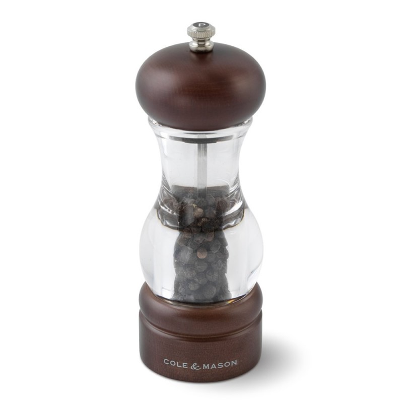This classic style pepper mill has a contemporary edge with the contrast of dark wood and clear acrylic a stylish addition to any table whilst remaining an everyday kitchen tool. Adjust the grind from fine to coarse by tightening or loosening the knob on the lid. The 105 Forest mills feature a hardened carbon steel mechanism for pepper and diamond sharp ceramic mechanism for salt and come with a lifetime guarantee. The Cole & Mason Precision mechanism does not crush peppercorns but strips them to release the maximum amount of flavour with each turn. To learn more about our mechanisms and which one best suits your seasoning needs . We recommend using high quality peppercorns and coarse rock salt in all our mills.