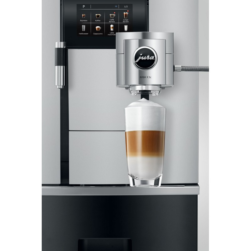 The automatic fill Jura Giga X3C Professional coffee machine boasts impressive style performance and simplicity. Ideally placed in large offices waiting or break areas the Giga X3C features easy touch-screen controls and a huge 31 beverage options including cappuccino cafe latte flat white and espresso.