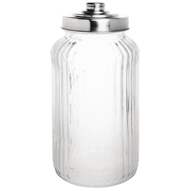 Add an element of vintage style to your kitchen or bar with this large ribbed glass jar. An ideal container for storing confectionary or preserves and looks great on any kitchen or bar shelf. The screw on durable stainless steel lid is airtight and will keep contents fresher for longer.