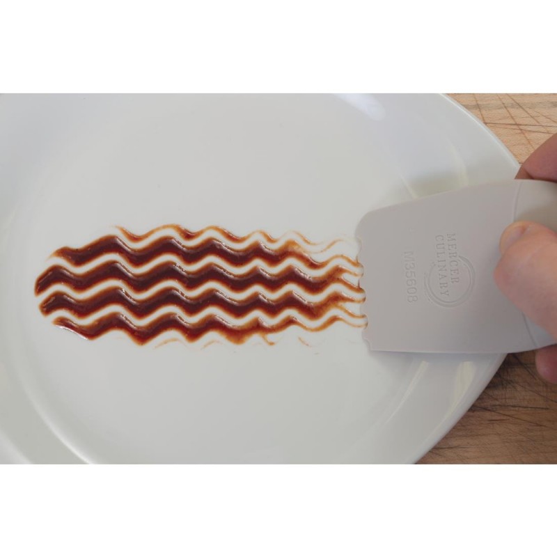 This flexible Mercer Culinary silicone plating wedge gives you total control with a specially designed recessed thumb rest so you can create intricate designs on your plate for the ultimate in artistic presentation. The silicone construction can withstand heat of up to 2 so is suitable for use with hot sauces.
