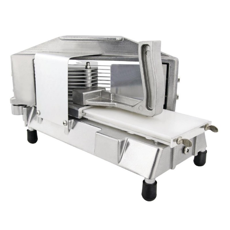 Reduce your prep time drastically with this Vogue Tomato Slicer designed to cut 5mm tomato slices with ease. No need to cut one slice at a time cut multiple slices at once with this heavy duty stainless steel machine and free up more time for other kitchen tasks. Spare blade available.