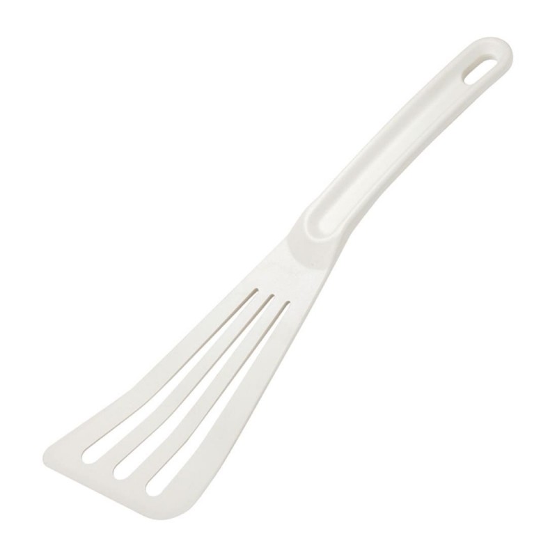 The Hells Tools Slotted Spatula White is a 12' spatula made from glass-reinforced nylon giving it the ability to stand up to 2 (4 ) perfect for use in busy domestic and commercial kitchens. A one-piece construction with stain and odour resistance work together to give the spatula a long life and make it easy to maintain and clean. NSF approved and HACCP compliant.