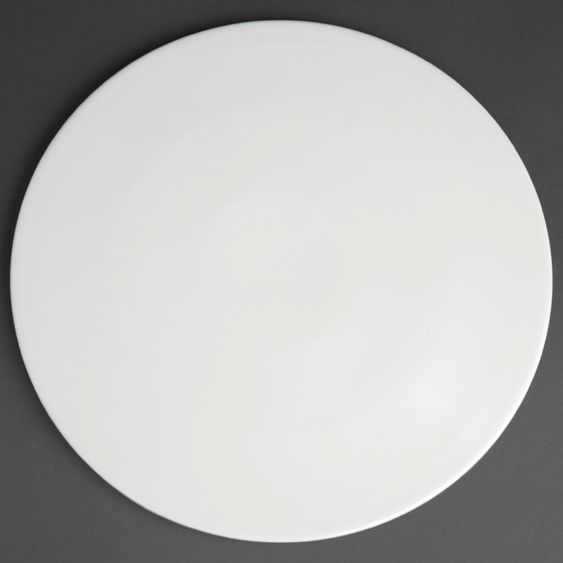 Created by Olympia this perfectly flat pizza plate gives the illusion that it is hovering above the tabletop as the foot of the plate is set back and is therefore not visible from a normal viewing angle on the table. The perfectly smooth raised surface allows pizza to easily slide to the edge and be picked up. As the plate is rimless it also makes an interesting surface to allow chefs to get creative.