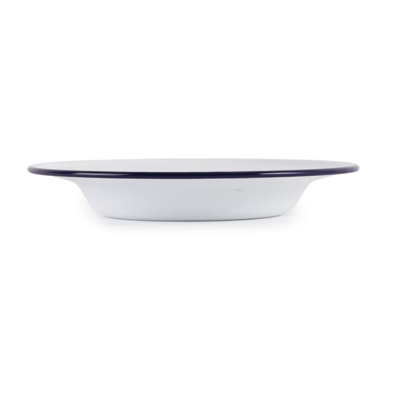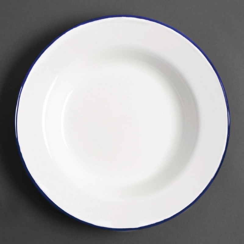 Let chips and imperfections become a positive enhancing the appearance of these soup plates. The more these plates are used and cooked with the more character they will take on. Crafted from heavy duty stainless steel and coated with an ultra-durable fused-glass coating these blue and white enamel soup plates from Olympia offer a truly unique addition to your table setting. The coating on these soup plates is heat and chemical resistant meaning they are safe for use in the oven and can be washed in the dishwasher.