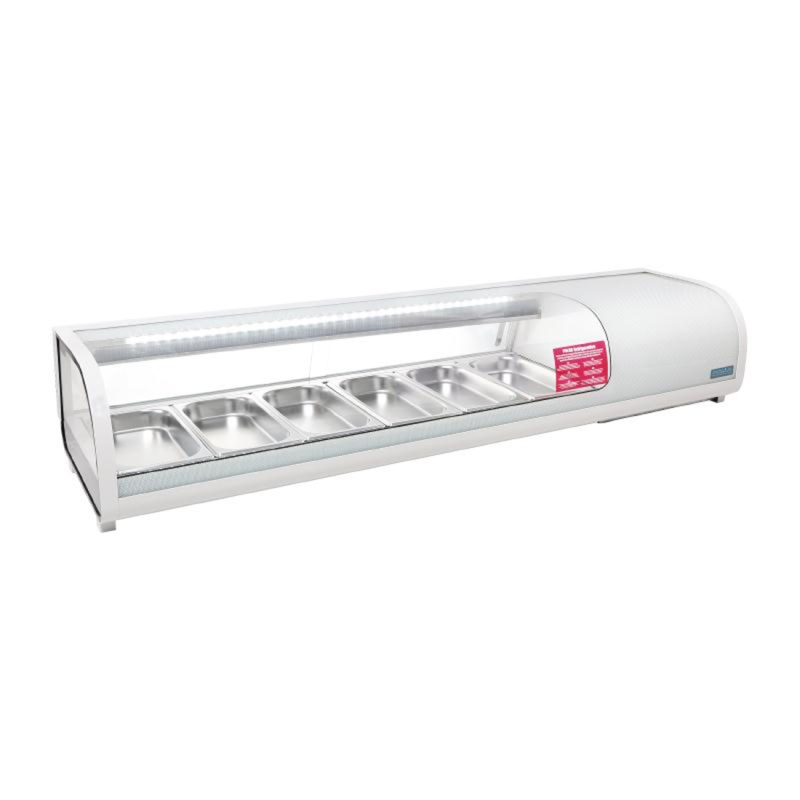 The Polar CP728 - If you're offering fresh tapas, desserts or salads to customers, the Polar Tapas Display Fridge offers a fantastic high-visibility merchandising solution. Suitable for cafés, delicatessens, coffee shops and more, the topper effectively keeps up to six 1/3 size gastronorm pans of food hygienically chilled and perfectly presented. With attractive curved glass and efficient LED lighting, this tapas showcase is ideal for maximising impulse sales.