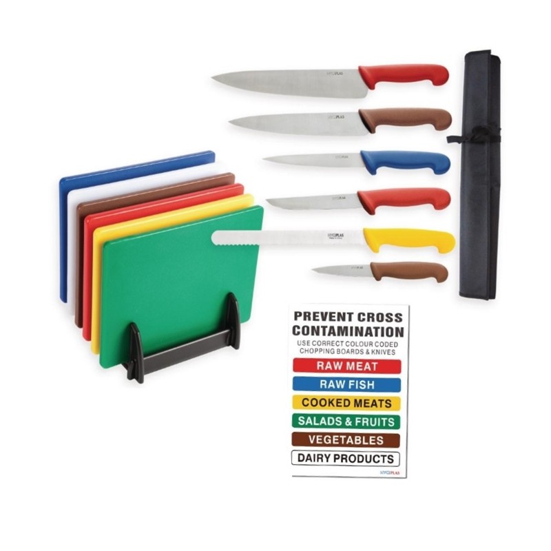 Prepare ingredients safely and effectively with the Hygiplas Chopping Boards and Knife Set. Colour coded to allow your staff to quickly use the correct equipment for each culinary task, the polyethylene boards help to prevent cross contamination in your kitchen. The durable boards are also supplied with a wipe-clean wall chart and plastic rack to help you organise your kitchen in accordance with hygiene regulations. Sold with colour coded knives, the set ensures that your food preparation is always safe and sanitary.